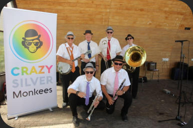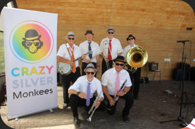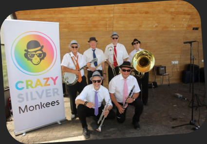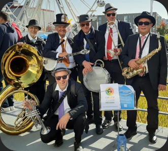 Links oben: fröhliche Stimmung beim Kreativmarkt 2019 in AbwilLinks unten: Geburtstags-Dixie in Homburg (TG)Rechts: Strassenmusik-Festival Oktober 2021 in Radolfzell (D)Unten: Aufstellung für‘s Pressefoto 2022 in Rorschach, Konzert im Pavillon am See
